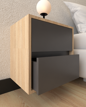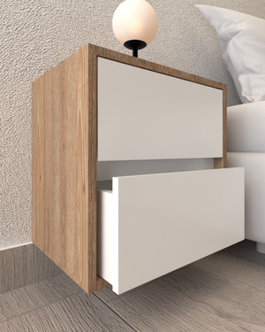 Elegante mesa de noche flotante, fabricada en aglomerado melamínico de alta calidad , diseñada para brindar funcionalidad y estilo al dormitorio. Su estructura sólida y líneas modernas la convierten en una pieza versátil que se adapta fácilmente a distintos ambientes decorativos.