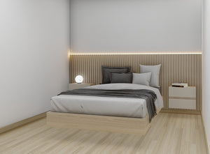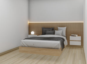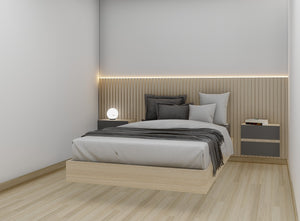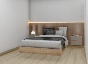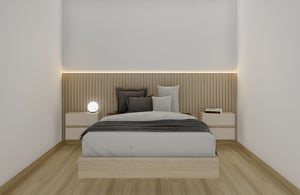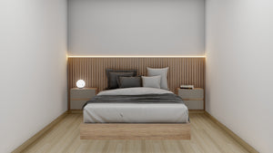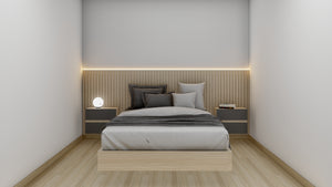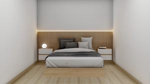 Espaldar fabricado aglomerado melamínico de alta calidad, diseñado para aportar elegancia y confort al dormitorio. Su estructura presenta listones decorativos distribuidos de forma uniforme, que resaltan las vetas y texturas del acabado tipo madera, ofreciendo un estilo moderno y natural.